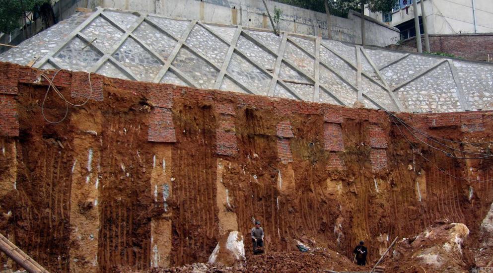 赖屋山宝山新村边坡地质灾害治理工程位于深圳市龙华新区大浪街道办宝山新村一区和二区之间。边坡坡顶及坡底为多层民宅,房屋距离边坡约8~10m,边坡平面上总体呈折线形展布。边坡长度216米,高度8.5m~14.0m,坡度35°~70°不等。边坡主要采用抗滑桩+坡顶格构梁放坡支护形式,坡顶坡脚采取有效的截排水措施,能有效防止滑坡等灾害情况发生。