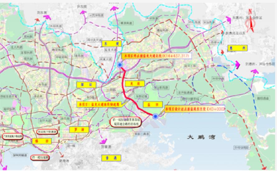 项目概况:南起盐田港东港区,北至水官高速龙岗收费站,全长14.4公里(隧道总长9公里),城市快速路标准,双向6车道,总投资约119亿元。